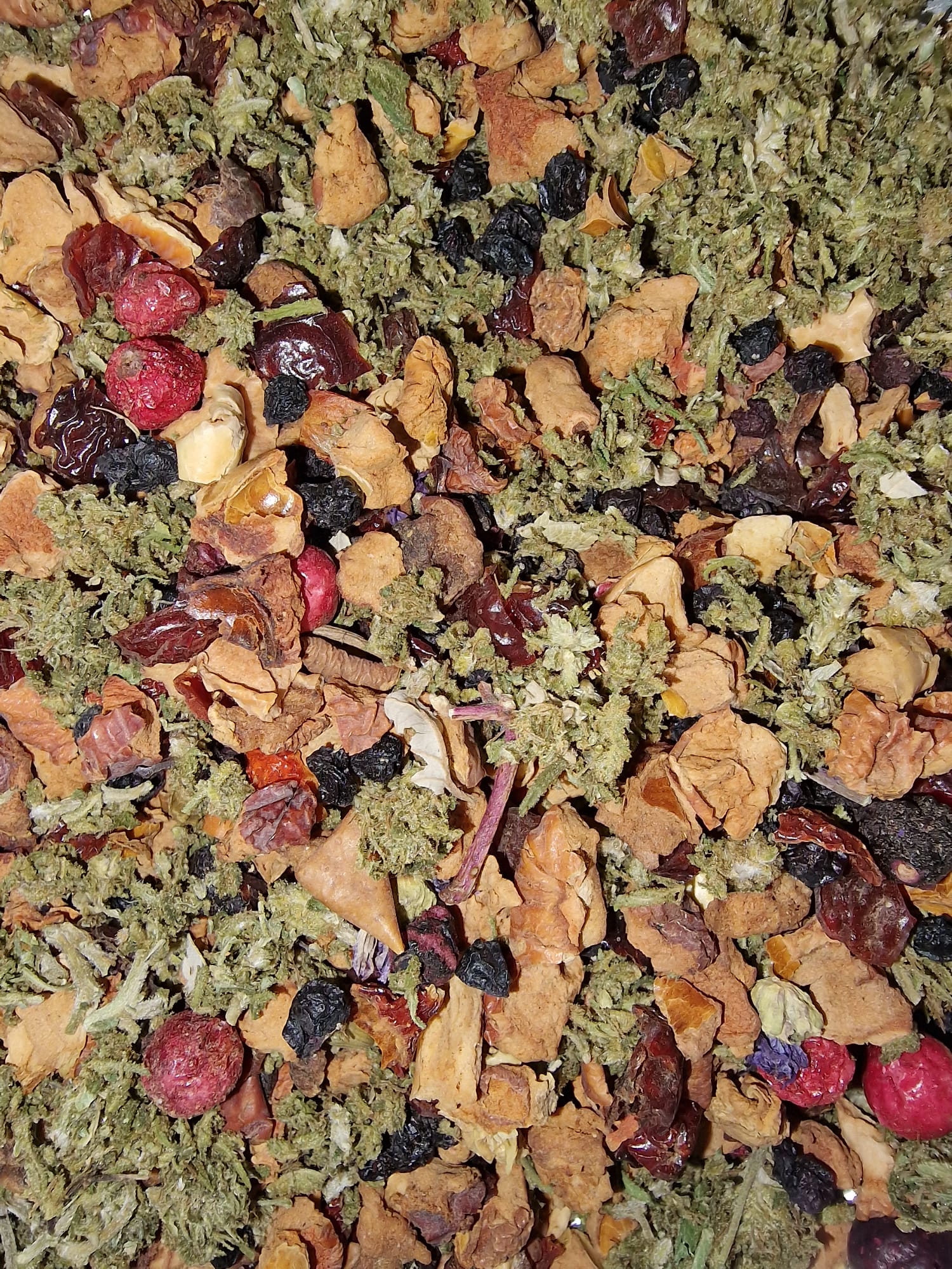 Pomme*, baie de sureau*, cynorrhodon*, myrtille sauvage*, mauve*, groseille*, feuilles de mûre*, cassis*, mûre*. *Issu de l‘agriculture biologique